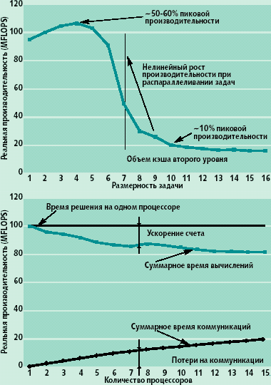 Между тем, векторизуемые задачи — далеко не единственные, требующие высокопроизводительных средств, а Linpack — вовсе не бесспорная оценочная программа, отражающая практически важные характеристики ВМВС. Невекторизуемые задачи, допускающие распараллеливание, могут решаться на массово-параллельных ВМВС с различной организацией оперативной памяти. Залог успеха при решении таких задач — локализуемость параллельно выполняемой части задачи в кэш-памяти и небольшой рост коммуникационных потерь. Такие условия хорошего распараллеливания объясняются, прежде всего, свойством современных микропроцессоров показывать высокие характеристики лишь при эффективном использовании кэш-памяти, а также все еще недостаточно высокими скоростями коммуникационных сетей. На рис. 2 показана типичная зависимость реальной производительности микропроцессора от объема обрабатываемых данных и характерное изменение скорости вычислений и коммуникационных потерь при распараллеливании. Вторую зависимость целесообразно рассмотреть подробнее.