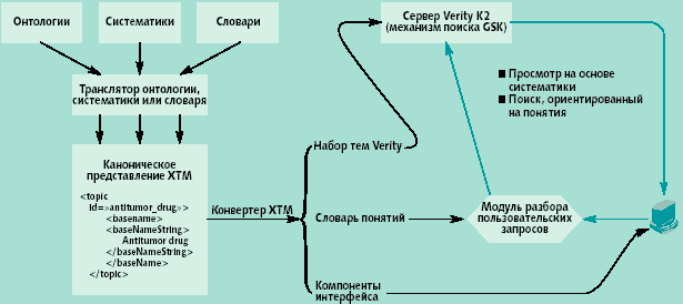 Специалисты по знаниям пишут программу, которая переводит онтологию, систематику или словарь в канонический формат карты тем XML (XML Topic Map — XTM). Затем они транслируют представление XTM с помощью конвертера XTM, который, в свою очередь, преобразует канонический формат в представление, воспринимаемое конкретным механизмом поиска (в нашем случае Verity). Конвертер предоставляет модулю разбора запросов словарь связей понятий, позволяя выполнять расширенный поиск, а также интерфейсные компоненты, которые Knowledge Navigator использует для работы с конвертированной информацией