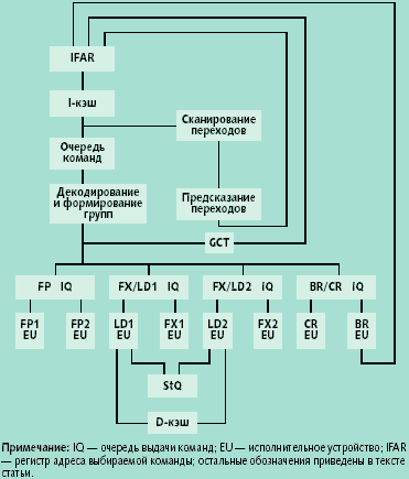 Первые стадии конвейера (IF, IC, BP), рис. 3, отвечают рассмотренным выборке команд и предсказанию переходов. Затем на стадиях с D0 по DG осуществляется декодирование и образование групп команд (по 5 команд на группу). Концепция группы команд введена в Power4 для упрощения логики внеочередной суперскалярной обработки «на лету» большого числа одновременно выполняемых команд. В отличие, скажем, от Pentium 4, в Power4 не реализована точная обработка прерываний, состояние процессора фиксируется «с точностью до группы команд». При этом команды из различных групп могут начинать выполняться во внеочередном порядке. Скажем, команда из последующей группы может запуститься на выполнение до какой-либо команды из предыдущей (если судить по исходным программным кодам) группы.