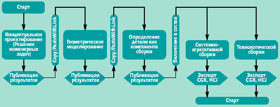 Далее осуществляется поиск других ранее выполненных моделей (прототипов), данные которых требуются для разрабатываемой модели. Если такие модели найдены, то из них проводится импортирование ссылок. После этого, производится доведение модели до уровня поставленных требований. Результаты работы публикуются, становясь доступными для импорта в другие модели (например, для использования на следующих стадиях проектирования). Таким способом обеспечивается сохранение конфиденциальности разработки, и «облегчаются» модели, наследующие полученные результаты. Это важно для последующего формирования больших сборок: они формируются из максимально «облегченных» моделей, которые, вместе с тем, обладают ассоциативностью со всеми порождающими моделями.