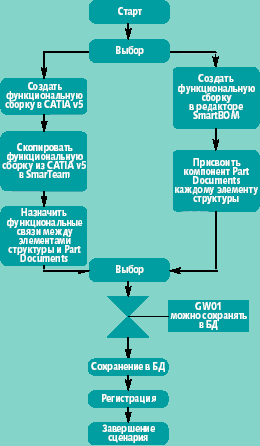 Обратим внимание на два способа формирования сборок. Левая ветвь иллюстрирует формирование сборок средствами CATIA. Этот способ является предпочтительным тогда, когда большая часть сборочных элементов выполнена в этой системе. Правая ветвь иллюстрирует альтернативный вариант, в котором сборки создаются средствами компонента SMARTEAM-BOM. Такой подход может оказаться эффективным при необходимости включения в сборку элементов, созданных альтернативными средствами и не имеющими представления в CATIA.