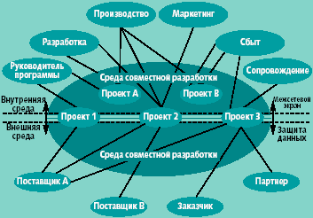 Свойственная системе Windchill ProjectLink (WPL) простота внедрения и дальнейшего использования определяется легкостью доступа к общему хранилищу данных, интерактивным характером взаимодействия с ним и соответствием предоставляемой им функциональности задачам каждого из этапов жизненного цикла изделия. На рис. 1 представлена модель среды совместного ведения проектов группами исполнителей в рамках расширенного предприятия.
