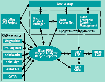 - средства, позволяющие реализовать сотрудничество между бизнес-партнерами в расширенном окружении виртуального предприятия и совместное использование ими информации, относящейся к изделию, — iBaan Product Packager, iBaan PartnerNet, iBaan Enterprise Content Management;