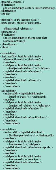 Карта тем XML представляет каждое понятие (например, Zantac) в виде темы; каждую связь как тему, которая является видом ассоциации; каждый экземпляр связи как тему, которая является конкретной ассоциацией.