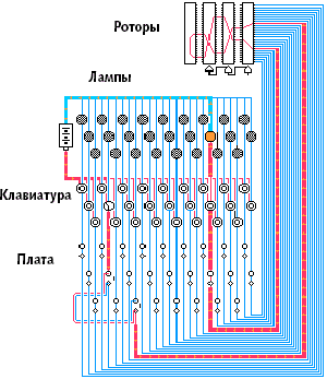 С «электрической» точки зрения конструкция Enigma тривиально проста. В ней есть клавиатура, состоящая в распространенном случае из 26 кнопок, соответственно 26 лампочек, на которых нанесены трафареты букв, включаемых с помощью клавиатуры, и батарея. Процедура работы такова: оператор нажимает на клавишу, соответствующую очередному символу зашифровываемого или расшифровываемого сообщения, в ответ загорается одна из регистра лампочек, та, которая в данный момент соответствует вводимому символу. Оператор считывает букву на трафарете и вписывает в формируемое сообщение. Механизм шифрования Enigma, в конечном счете, представляет собой сложную систему коммутации, врезанную в цепь между кнопкой и лампочкой, которая обеспечивает в каждый данный момент времени передачу тока по одному из огромного числа потенциально возможных соединений. Коммутацию этого псевдослучайного соединения обеспечивают несколько элементов конструкции, прежде всего роторы. По мере совершенствования число роторов возрастало с трех до пяти, рабочий комплект роторов можно было составлять из стека, состоящего из большего числа роторов, появлялись дополнительные устройства, но конструкция самого ротора оставалась неизменной. Его суть в том, что ротор представляет собой многополюсник, у него 26 входных и 26 выходных контактов, внутренняя проводка, размещенная в нем, соединяет контакты между собой в тонко сконструированном «случайном» порядке, который сохраняется для данного типа ротора. На разных устройствах Enigma находились роторы одних и тех же типов. В качестве одной из мер, на которые немцы шли для повышения секретности, стало увеличение числа роторов, на машине мог находиться набор сменных роторов, которые можно было чередовать в заданной последовательности. Сами роторы были очень дороги, поэтому к экземплярам старым прибавляли новые.