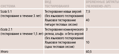 Подсчитаем теперь время, сэкономленное на языковом тестировании. По нашей оценке скорость, с которой тестер вводит информацию на языке, отличном от английского, в 15 раз меньше скорости ввода этой информации плеером. (Это очень оптимистичная для скорости ввода человеком оценка, ведь среди тестируемых языков есть такие языки, как китайский, японский и арабский.) Умножая 45 минут на 15, получаем примерно 11 часов работы человека. Умножая это время на 40 (число скриптов), на 23 (число поддерживаемых языков, отличных от английского) и на 2 прогона (второй прогон — для проверки правок ошибок, найденных при первом), получим примерно 2530 человеко-дней, или примерно 10 человеко-лет. За 3 года языковое тестирование проводилось 4 раза. Таким образом, получившаяся экономия составила 40 человеко-лет.