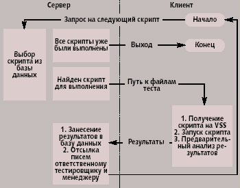 Для хранения скриптов используется Microsoft Visual Source Safe (VSS). На первом этапе скрипты поочередно запускались для выполнения на специально выделенном сервере. Такое решение было вполне удовлетворительным до тех пор, пока общее время выполнения скриптов не превышало 24 часов. Однако по мере накопления скриптов этот порог был превышен; мы не успевали тестировать каждую из ежедневно собираемых версий. Так как большинство скриптов работает независимо друг от друга, мы попытались распараллелить их выполнение. Была создана клиент-серверная программа, позволяющая распределить выполнение скриптов между несколькими клиентскими машинами (рис. 4).
