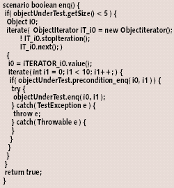В целом тестовый сценарий описывает итераторы для всех методов данного класса, однако каждый раз разработчик теста решает только локальную проблему — как перебрать входные параметры одного-единственного метода. Общую задачу — как организовать последовательность вызов; как нужное число раз вернуться в одно и то же состояние, чтобы провести испытание еще для одного метода, еще для одного значения параметра; когда остановиться, чтобы не делать лишней работы — все это берет на себя инструмент.