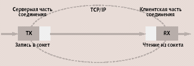 | Рис. 2. Передача данных от сервера клиенту (TX и RX — буферы передачи и чтения соответственно) |