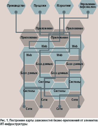 Инфраструктура вычислений по требованию призвана гарантировать отображение компонентов ИТ-инфраструктуры в бизнес-процессы и решение различных задач ИТ-подразделения в соответствии с установленными соглашениями об уровне обслуживания. Основной механизм, который позволяет достичь такого отображения, — это мониторинг транзакций и сетевого трафика и генерация сообщений о производительности с точки зрения приоритетов бизнеса. В CA Unicenter уже реализованы механизмы автообнаружения систем, сетей, баз данных, приложений и других инфраструктурных компонентов и их взаимосвязи с различными бизнес-процессами. В дополнение к существующим возможностям развивается новая технология Sonar, которая позволит определять все инфраструктурные компоненты, поддерживающие работу конкретного приложения, и их взаимозависимости (рис. 1).