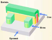 | Рис. 1. Структура созданного в Intel опытного образца трехвентильного транзистора. Сток соединяется с истоком вертикальным каналом, а вентиль охватывает канал с трех сторон. Свойства этой структуры лучше, чем у монолитных плоских транзисторов; она обеспечивает очень хорошее управление током внутри канала, весьма хорошие характеристики напряжения тока, а также допороговые откосы |