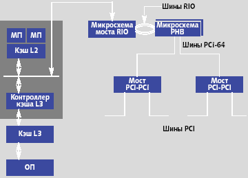 Общая структура подсистемы ввода/вывода SMP-компьютеров на базе POWER4 приведена на рис. 3. Она фактически определяется использованием микросхем трех типов: мост RIO (Remote I/O), мост PCI-хоста (PCI Host Bridge, PHB) и мост PCI-PCI. Мост RIO подсоединяется к микросхеме POWER4 через ее шину GX шириной 4 байта, работающей на одной трети частоты процессора. Для передачи данных дальше по направлению к внешним устройствам микросхема RIO-моста использует две RIO-шины 500 Мгц шириной в 1 байт. Эти шины связывают мост RIO с микросхемами PHB, которые поддерживают 64-разрядные шины PCI, работающие на частотах 66/33 МГц. В более поздних версиях применяются шины RIO-2, работающие уже на частоте 1 ГГц, а вместо шин PCI — более высокоскоростные шины PCI-X с частотами до 133 МГц.