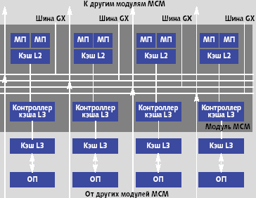 Основной строительный блок SMP-cистем на базе POWER4 — модуль МСМ, содержащий четыре процессорные микросхемы; учитывая их «двухядерность», это дает 8-процессорную SMP-конфигурацию (рис. 2). В свою очередь, несколько модулей МСМ могут быть связаны между собой, образуя конфигурации с 16, 24 или 32 процессорами.
