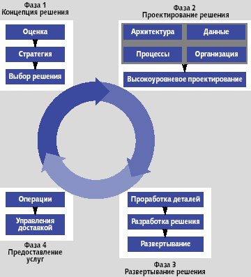 - Развертывание решений. Неграмотно выполненное внедрение может дискредитировать даже удачно задуманное решение. Процедура жн внедрения должна быть унифицирована и выполняться примерно одинаково, как при развертывании системного программного обеспечения, так и при установке оборудования, бизнес-приложений и баз данных. Развертывание нового решения внутри уже существующей конфигурации должно осуществляться с минимальными нарушениями работоспособности последней. Особую роль в успешном внедрении играет управление изменениями: требуется идентифицировать все задачи, имеющие отношение к каждому конкретному изменению и контролировать их; необходим анализ результатов изменений; ведение базы изменений; полезен также план координации всех технологических изменений внутри организации с целью выполнения максимального количества изменений при минимальных нарушениях работоспособности бизнеса. Также важна оценка рисков для бизнеса в случае возникновении сбоев при внедрении.