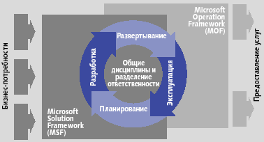 MOF концентрируется на обеспечении требуемого качества эксплуатации информационных систем. Вопросы упорядочения проектной деятельности рассматриваются в документе Microsoft Solutions Framework (MSF), описывающем принципы проектирования, разработки, внедрения и модификации программных и инфраструктурных решений. MSF тесно связан с MOF (рис. 2), и совместное использование этих подходов позволяет построить в организации целостную систему обеспечения всего жизненного цикла применения ИТ для удовлетворения бизнес-потребностей.