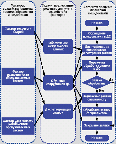 В материалах ITIL отсутствуют рекомендации по учету воздействия таких разнотипных факторов. Поэтому, прежде всего, был определен перечень задач, которые необходимо было решить, чтобы учесть все факторы, влияющие на структуру и деятельность ЦДС, а также разработан алгоритм процесса «Управление инцидентами». В общем виде такой алгоритм приведен на рис. 2, где в качестве примера показаны три фактора, воздействующих на процесс «Управление инцидентами»: фактор текучести кадров; фактор разнотипности обслуживаемых систем; фактор удаленности компонентов обслуживаемых систем. В центре рисунка представлены задачи, которые необходимо было решить для учета воздействия этих факторов: задача обеспечения актуальности данных; задача обучения сотрудников ЦДС; задача диспетчеризации заявок.