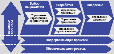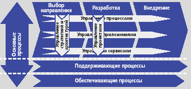 Видению внутренних проблем в управлении ИТ и путей их преодоления посвящен цикл из семи статей под общим названием «Врачеватель ИТ, да исцели себя сам» [4]. Это чрезвычайно интересный документ, достойный внимательного изучения теми, кто задумывается всерьез об использовании средств и методов управления ИТ на своем предприятии. Из него следует, что сегодня можно говорить о нескольких сложившихся направлениях в управлении: управление ИТ-проектами (IT Project Management), управление ИТ-услугами (IT Service Management), управление ИТ-приложениями (IT Applications Management), управление ИТ-инфраструктурами (IT Infrastructure Management), управление ИТ-стратегией и архитектурами (IT Strategy&Architecture Management). Каждое их этих направлений развивалось по собственным правилам, имело собственные техники и методологию, они вели параллельное существование.