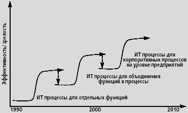 Для того чтобы найти пути к преодолению этой раздробленности, необходимо, прежде всего, оценить происходящее. За последние двадцать лет автоматизация бизнеса и соответственно ИТ прошли три основных этапа, на каждом из них степень интеграции повышалась, первый — автоматизация отдельных функций, второй — автоматизация процессов, третий — автоматизация предприятия в целом. Для иллюстрации этой динамики иногда используют так называемые S-кривые (рис. 2), где каждая из «S» отражает развитие на этапе, а все вместе — глобальную тенденцию. Средства управления ИТ с неизбежностью должны развиваться, повторяя в точности эти траектории (рис. 3). В конечном счете, основные составляющие управления ИТ должны слиться в единую корпоративную систему управления ИТ-средствами (IT Enterprise Management).