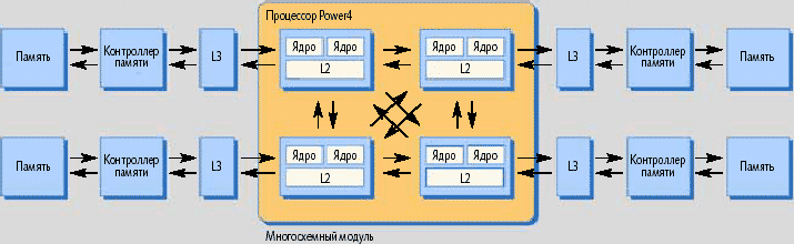 | Многосхемный модуль в системе Power4. Процессоры имеют по два процессорных ядра, каждое из которых выполняет единый программный контекст. Каждое ядро содержит кэш первого уровня, использует совместно с другими ядрами кэш второго уровня и связано с расположенным вне кристалла кэшем третьего уровня, контроллером памяти и основной памятью |