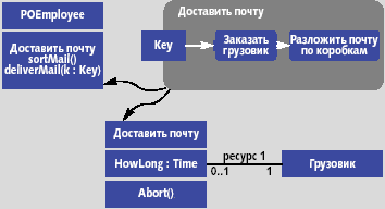 В UML 2 поддерживается концепция параметризованного поведения не только для деятельности, а для всех типов работ UML. Это означает, что конечные автоматы, взаимодействия и деятельность могут быть параметризованными и служить методами объектов или вызываться напрямую единообразным способом. В правой верхней части рис. 9 показана модель деятельности для работы DELIVERMAIL (волнистые стрелки не являются частью нотации UML). DELIVERMAIL можно просто вызывать через действие CALLBEHAVIORACTION, или как метод класса POEMPLOYEE через действие CALLOPERATIONACTION. В любом случае эта работа принимает в качестве входных данных экземпляр KEY. Поскольку работы могут вызываться напрямую или как операции, UML 2 предоставляет путь к постепенному усвоению объектно-ориентированного подхода [3].