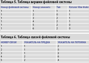 Рассмотрим пример файловой системы (рис. 5), отображаемой в таблицы реляционной базы данных: таблица вершин, таблица связей, таблица информационных полей каталогов и таблица информационных полей файлов (таблицы 5-8). На рис. 5 каталоги изображены прямоугольниками, а файлы кружками.