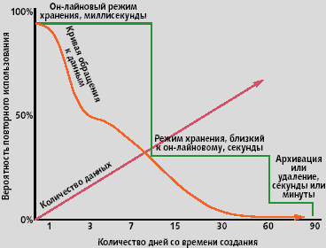 То обстоятельство, что данные стремительно стареют (например, как следует из графика на рис. 1, по истечению месяца вероятность повторного использования данных снижается до единиц процентов), способствовало формированию в середине 90-х годов так называемой концепции Nearline, авторы которой рассматривали технологию работы с данными чрезвычайно примитивно. Они полагали, что по окончании видимого жизненного цикла данные следует архивировать, а затем еще несколько лет подержать в архивированной форме, после чего — просто уничтожать. Эта концепция попросту наивна, поскольку определенные данные могут быть востребованы через многие десятки лет, о чем свидетельствует действующая система бумажных архивов, вопрос в том, о каких данных идет речь.