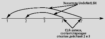 Предположим, сначала некоторая транзакция совершила несколько действий, а затем вследствие каких-то причин начала откат. Ее действия будут последовательно откатываться в обратном порядке относительно их совершения. Каждому действию будет соответствовать своя CLR-запись. На рис. 1 показаны ссылки UndoNxtLSN компенсационных записей, созданных при откате второго и третьего действий. Таким образом, поле UndoNxtLSN последней такой записи содержит LSN следующего действия транзакции, которое нужно будет обработать при откате.