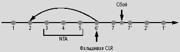 Рис. 2 иллюстрирует схему работы NTA для записей журнала, созданных одной транзакцией. Записи, номера которых помечены штрихом, являются компенсационными (скажем, если 1 — запись журнала, то 1? будет для нее компенсационной). Записи 3, 4 и 5 на рисунке образуют NTA. Компенсационная запись 6? не имеет пары; это объясняется тем, что ее единственное назначение — фиксировать изменения, внесенные NTA. Далее показано, какие действия будут отменены при откате транзакции после сбоя, произошедшего после завершения NTA. Все шаги, совершенные NTA, не будут отменены, поскольку поле UndoNXT фиктивной компенсационной записи 6? указывает на запись 2.