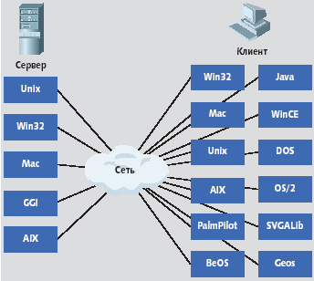 Система X появилась раньше, чем архитектуры «клиент-сервер» в их традиционном понимании. Поэтому она опирается на своеобразную и, на первый взгляд, странную для уха большинства специалистов трактовку ролей сервера и клиента. Здесь все наоборот: клиентом является обслуживающая программа, расположенная на физическом сервере, а сервером — программное обеспечение, размещенное на терминале. Известно несколько реализаций Х, в том числе система Motif, принятая в качестве промышленного стандарта IEEE 1295; ее основным приверженцем является компания Sun Microsystems. Стоит привести примеры и современных разработок, реализующих X.