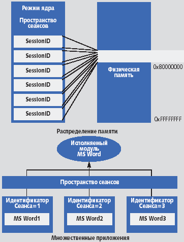 В Windows 2000 Terminal Services механизм SessionSpace сохранился, но изменилась карта распределения памяти. Это предпринято с тем, чтобы сделать Windows 2000 более универсальной, независимой от того, инсталлированы или нет в конкретной информационной системе терминальные сервисы.