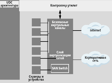Виртуализация систем хранения и сетей - это лишь предпосылка для создания виртуальных центров данных (корпоративных систем grid, Enterprise Grid), теоретически способных решать любую задачу пользователя. Как видно из рис. 3, такие центры «собираются» из ресурсов, сосредоточенных в физических центрах и главным консолидирующим элементом здесь выступает контроллер утилит, обеспечивающий объединение и разделение ресурсов, унификацию доступа к пулам сервисов, управление безопасностью и т.п.