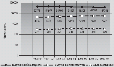 Уровень выпуска трехзвенной системы ИТ-образования в США в течение последних лет, по данным официальной статистики, оставался практически неизменным (см. рис. 1, 2). «Пирамида» численности основных профессиональных групп на рынке труда представлена на рис. 3. За единицу отсчета принята численность исследователей (специалистов высшей квалификации).