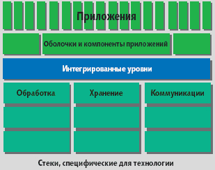 В общем и целом программное обеспечение имеет многоуровневую архитектуру, как показано на рисунке. На верхнем уровне находятся различные приложения, а на нижнем — технологии, каждая из которых развивается относительно независимо благодаря гомогенным, комплексным, промежуточным уровням [3]. При приближении к нижним уровням продукты становятся в меньшей степени ориентированными на конкретные приложения, но более технологически зависимыми.
