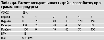 Преимущество NVP перед ROI можно проиллюстрировать следующим примером. Допустим, некая компания намерена инвестировать в разработку продукта 100 тыс. рублей. Продажи продукта по годам составят 20, 40, 80, 120, 150 тыс. рублей, а затраты на маркетинг, продажи и поддержку, соответственно, 20, 30, 40, 50, 50 тыс. рублей. Средняя стоимость капитала (WACC) в ИТ-отрасли — около 25% годовых. Остается подставить все это в формулы и получить результат (см. Таблицу).