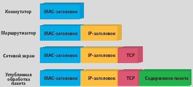 | Рис. 3. Анализ пакета устройствами, относящимися к основным категориям, в соответствии с функциональным назначением его компонентов. Лишь очень немногие устройства способны на углубленное изучение пакета, которое необходимо для раннего обнаружения атак типа SQL Slammer |
