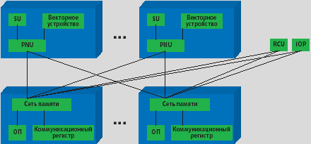 Узел SX-6/7 помимо процессоров включает в себя коммутационное соединение процессора с памятью, устройства управления памятью (MMU) и устройство управления удаленным доступом (RCU), служащее для обмена данными с другими узлами, а также до 4 процессоров ввода-вывода IOP (рис. 3). Компоненты используемого в узлах координатного коммутатора расположены в сетевых процессорах (PNU) и в блоках MMU.