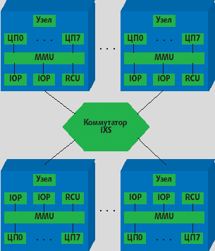 В многоузловой системе отдельные 8-процессорные узлы связываются координатным коммутатором IXS, для чего используются блоки RCU. RCU обеспечивают прием и передачу данных с пропускной способностью 8 Гбайт/с.