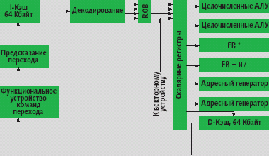 VPU содержит регистр маски и 72 векторных регистра длиной 256 64-разрядных слов, содержимое которых, в отличие от SU, не кэшируется. SU осуществляет функции управления VPU и выполняет скалярные команды, фактически имея микроархитектуру суперскалярного микропроцессора с динамическим предсказанием переходов и спекулятивным внеочередным выполнением команд (рис. 2). (Любопытно, что в предыдущих моделях SX скалярное устройство было копией микропроцессора MIPS R10000.)