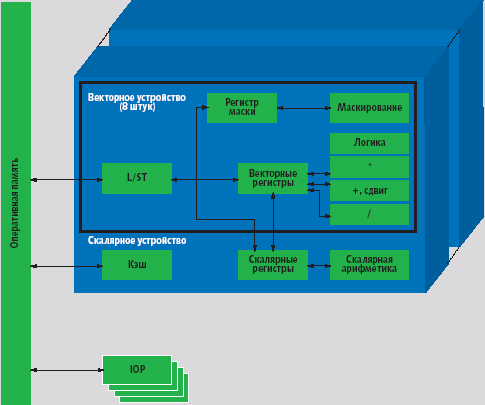 В свою очередь, VPU состоит из управляющего устройства и векторного функционального устройства (VFU), которое содержит конвейеризированные блоки для сложения/сдвига, умножения, деления и логических операций. Помимо VFU, имеется устройство для выполнения операции маскирования, позволяющей векторизовать конструкции ветвления (например, операторы IF в Фортране) и устройство загрузки/записи векторных регистров.