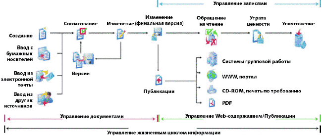 Согласно определению AIIM, профессиональной организации в области управления информацией, Enterprise Content Management, или управление информационными ресурсами предприятия — это набор технологий, инструментов и методов, используемых для сбора, управления, накопления, хранения и доставки информации всем потребителям внутри организации. В целом ECM ориентируется на работу с неструктурированной информацией в любом виде, включая обычные офисные документы в формате Word или Excel, PDF, а также рисунки, чертежи, графики, сканированные изображения и вообще файлы любых форматов, сообщения электронной почты, Web-страницы, видео и другую информацию в электронном виде. Основная задача ECM состоит в поддержке полного жизненного цикла информации (рис. 1).