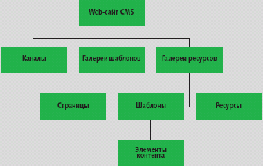 CMS хранит содержание в виде объектов, а сборка Web-страниц производится по запросу из специального кэша. Благодаря этому определенное содержание может неоднократно использоваться для разных целей без специального программирования и дублирования. Одно и то же содержание может разделяться между несколькими Web-страницами на сайте. Построенный с помощью CMS сайт имеет древовидную структуру (рис. 2) и включает следующие типы объектов: