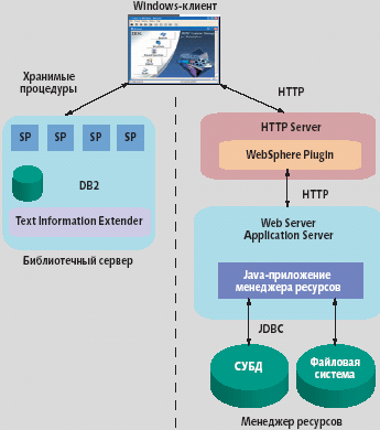 Библиотечный сервер — это сервер баз данных DB2 с набором дополнительных хранимых процедур. Все запросы на поиск документов преобразуются в SQL-операторы и выполняются на библиотечном сервере.