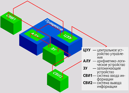 Неслучайно, что среди пионеров, формировавших исходные представления об ИТ, были выдающиеся математики. Используя возможности фундаментальной науки, они предлагали инструментарий для количественных моделей процессов и систем, позволявший эффективно оценивать их практическую реализацию. При этом существенно, что получаемое решение не было единичным. Оно могло масштабироваться на ряд практических реализаций, его можно было оптимизировать в рамках избранной модели. Чтобы еще раз убедиться в этом, достаточно вспомнить модель вычислительной машины фон Неймана, определяющую до настоящего времени структурные представления цифровых вычислительных машин (рис. 1). Все это дало важное преимущество использованию ИТ.