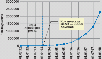 В конечном счете, социологический мониторинг критической массы связан с ожиданиями коммерческого успеха Internet-начинаний, который ассоциируется с такими понятиями как «спрос» и «предложение». Число пользователей — это оценка спроса, а число зарегистрированных в национальной зоне доменов можно, видимо, считать оценкой предложения. В конце концов, пользователи Internet «ходят» в Сеть за информацией, а она размещена, главным образом на сайтах, которые, в свою очередь, имеют доменные имена. Если верна формула «спрос рождает предложение», то кроме числа пользователей должно увеличиваться и число зарегистрированных доменов. Домен COM дает тому наглядное подтверждение (рис. 1). «Критическая» масса в зоне COM была достигнута в 1994 году, и линейный рост сменился экспоненциальным. При этом следует отметить, что основной «двигатель» коммерческого успеха Internet-технологий — World Wide Web — фактически появился позже, чем была достигнута критическая масса пользователей.