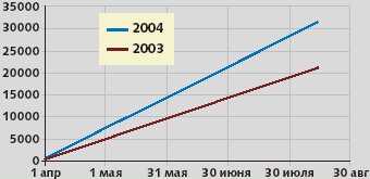 Однако кое-какие положительные изменения все же происходят. Мониторинг динамики регистраций (рис. 3) показывает, что темпы регистрации доменов в 2004 году выше, чем в 2003. Характер динамики роста не изменился и остался линейным, но эта линия идет заметно круче. Период майских праздников и летних отпусков выбран не случайно. Обычно в это время темпы регистраций существенно падают, но в нашем случае эти сезонные колебания тенденции не меняют. Линейный характер роста числа зарегистрированных доменов, видимо, связан с экстенсивным расширением Рунет, т.е. по мере физического подключения новых пользователей к Сети появляются и новые домены. У большинства этих пользователей еще не наступило озарение, что кроме банального «Вася и Петя уже здесь» можно «учудить» что-нибудь более полезное. Одним словом, не все так плохо и хочется надеяться, что у Рунета все еще впереди.