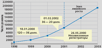 Интересно сравнить тенденции регистрации доменов, наблюдаемые в США с отечественными. Данные РосНИИРОС (www.ripn.net) и Ru-center (www.nic.ru) свидетельствуют о том, что намечавшийся в 1998 году показательный рост числа регистраций доменов в национальной зоне RU постепенно, после 2000 года, сменился линейным ростом (рис. 2).