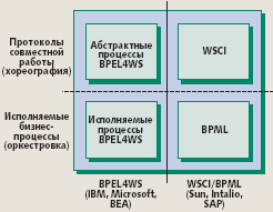| Рис. 4. Взаимосвязь стандартов оркестровки и хореографии: языки BPEL4WS, WSCI и BPML |