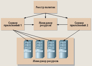 Политики для серверов приложений сформулированы таким образом, чтобы обеспечить параметры, оговоренные в соглашении об уровне обслуживания (скажем, время отклика). В зависимости от нагрузки серверы приложений могут требовать больше или меньше ресурсов из общего пула. Управление ресурсами осуществляет сторонний агент — менеджер ресурсов. Все политики, управляющие системой, хранятся в общем реестре политик.