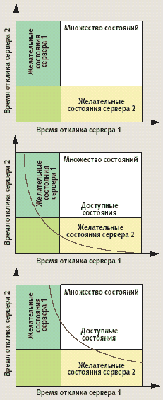 В данной модели используются три разные политики — определяющая управление серверами уже выделенными им ресурсами, определяющая запрос новых ресурсов у менеджера ресурсов в случае их нехватки, наконец, определяющая реакцию менеджера ресурсов на подобные запросы. Множество состояний описанной системы может быть представлено совокупностью двумерных векторов, где каждая координата описывает фактическое время отклика каждого сервера при данном распределении ресурсов (рис. 2).