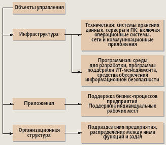 По Тайеденсу, ИТ-менеджмент охватывает (рис. 1) управление всеми компьютерными и коммуникационными ресурсами предприятия. Его основная задача состоит в создании и поддержании в работоспособном состоянии приложений и инфраструктуры, на которой они исполняются. Подобный менеджмент можно разделить на три уровня: операционный, тактический и стратегический. Создание системы управления ИТ, как и любой другой системы управления, предполагает определение управляемых объектов и управляющих воздействий.